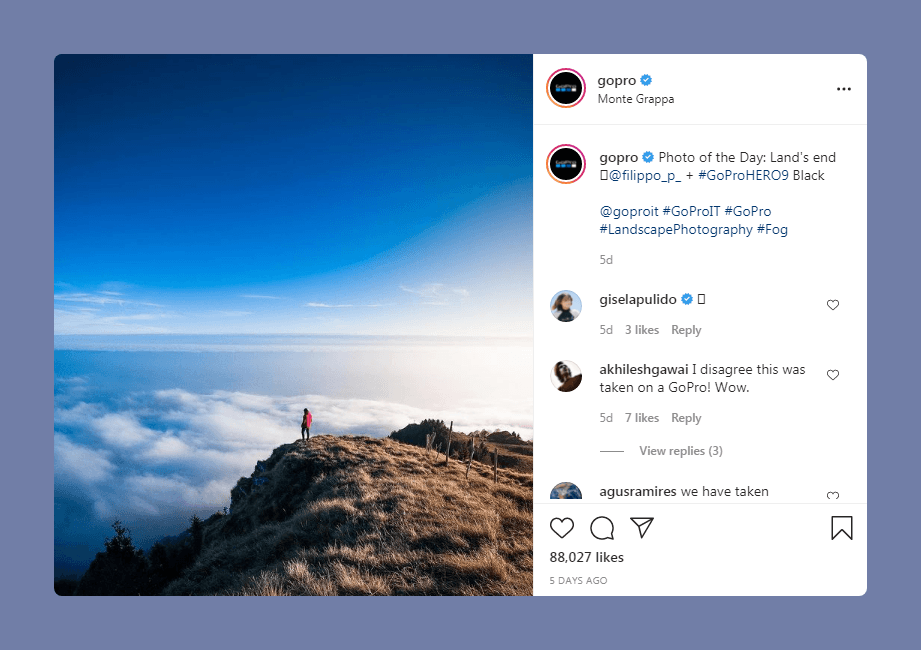 Relatability or craziness determines how your content performs from the engagement point of view. Here, exploring beautiful but dangerous places is craziness for most people. That is why this post increases the chance of people engaging with GoPro’s content and also positions the brand as a lifestyle instead of just a camera.