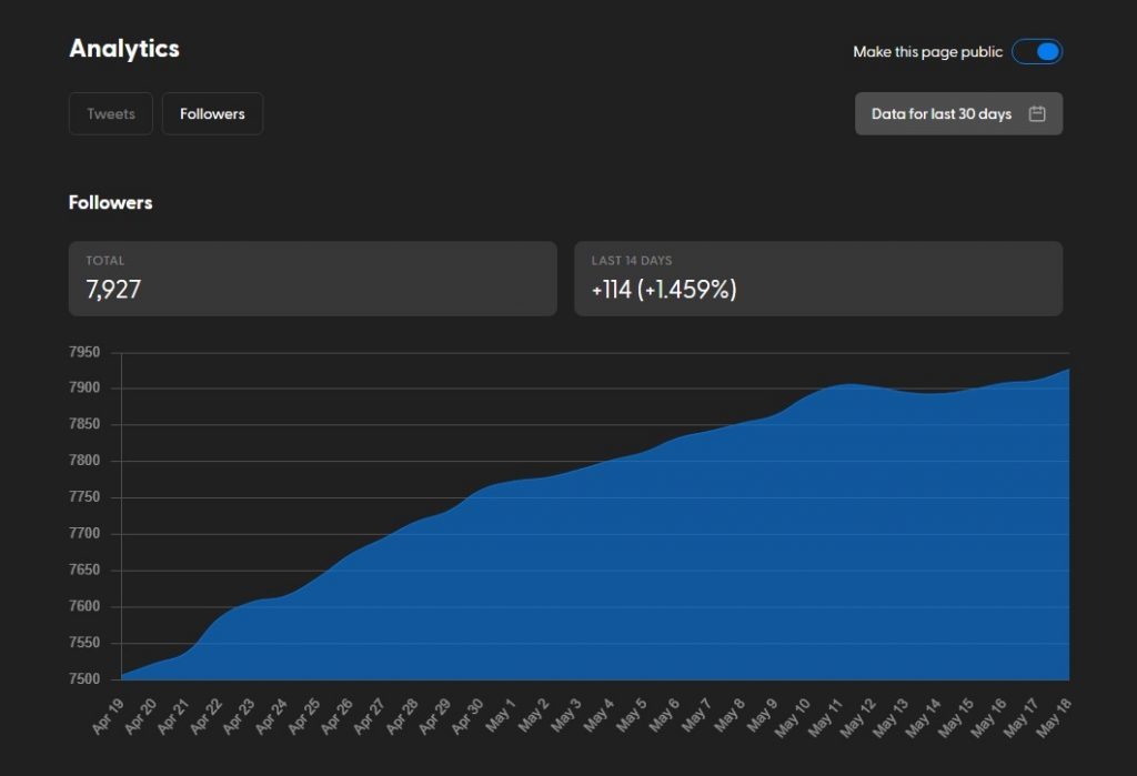 You can also choose to make your analytics public with Hypefury – to show your audience your progression and demonstrate some humility and faith! It’s a great way to build in public and make your followers part of your journey. For instance, take a look at Hypefury’s analytics!