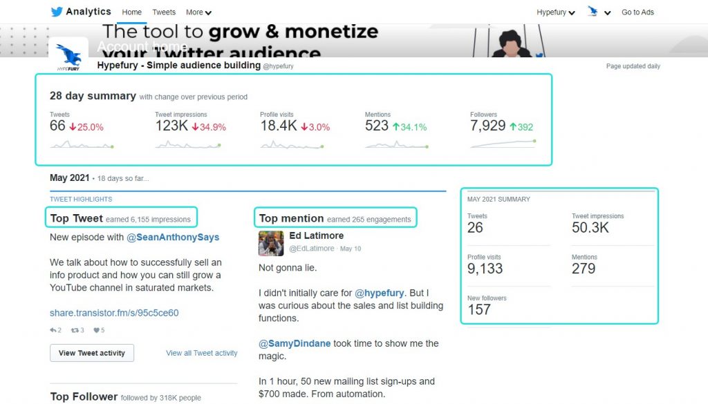 Twitter analytics are great to review monthly, but if you want to get a clear picture of where your account is fast, Hypefury analytics is the perfect tool!