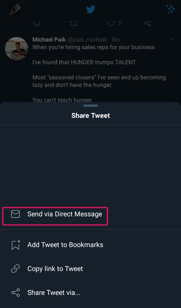 You can also send a direct message from the timeline by clicking on the share icon and selecting “send via Direct message.” You’ll then have the option to search for a user to send the tweet you want to share.