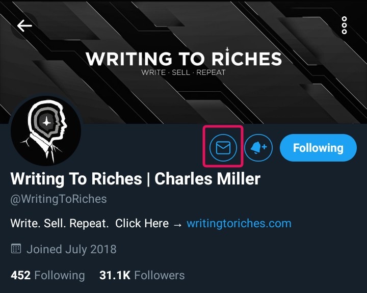 On Twitter, the DM button is a little envelope icon on the profile page just to the left of the follow and notification buttons. However as mentioned above, some accounts will have this feature turned off and that button will not be present. Another way you can create and send a DM is by clicking on the messages section and then the compose new message button. It will bring up a screen to allow you to search for accounts. You can select who you want to message and go from there.