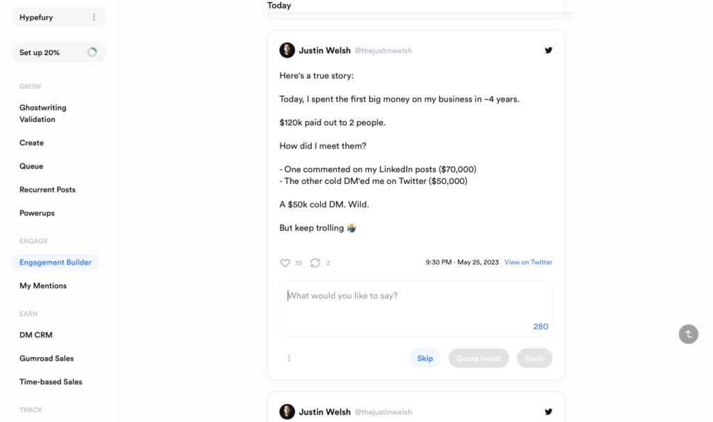 Hypefury auto-comments your newsletter, course, website, below your tweets that do well.