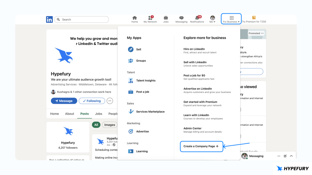Here is how you can create a LinkedIn company page 1. Log in to your LinkedIn account 2. Click the For Business icon in the upper-right corner of your LinkedIn homepage 3. Click on Create a Company Page